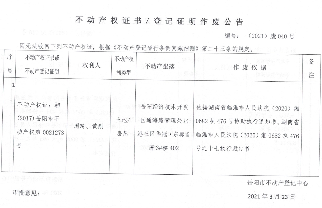 不动产权证书、登记证明作废公告 编号: (2021)废040号(周玲、黄刚)