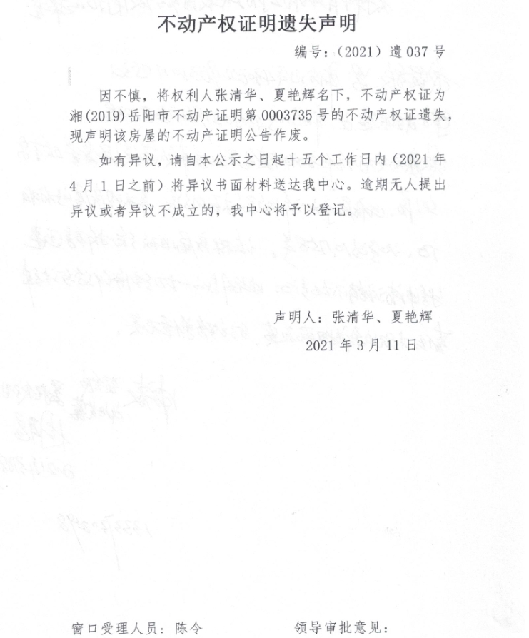 不动产权证明遗失声明 编号:(2021)遗037号(张清华、夏艳辉)