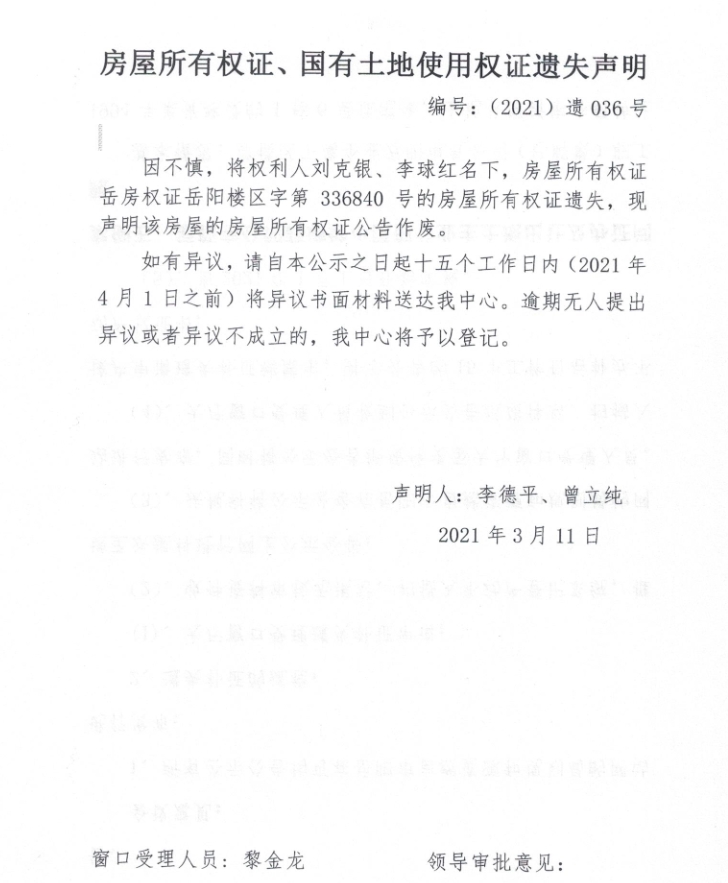 房屋所有权证、国有土地使用权证遗失声明 编号:(2021)遗036号(刘克银、李球红)