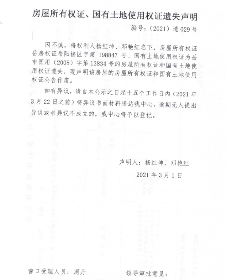 房屋所有权证、国有土地使用权证遗失声明 编号:(2021)遗029号(杨红坤、邓艳红)