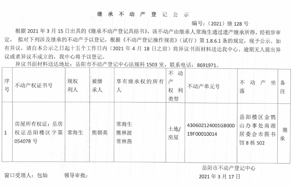 继承不动产登记公示 编号:(2021)继128号(常海生)