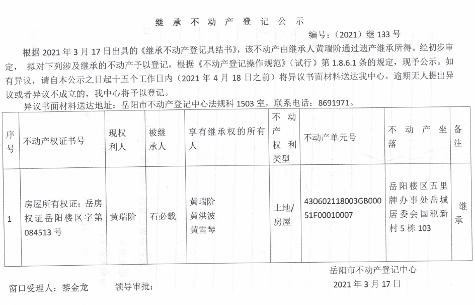 继承不动产登记公示 编号:(2021)继133号(黄瑞阶)