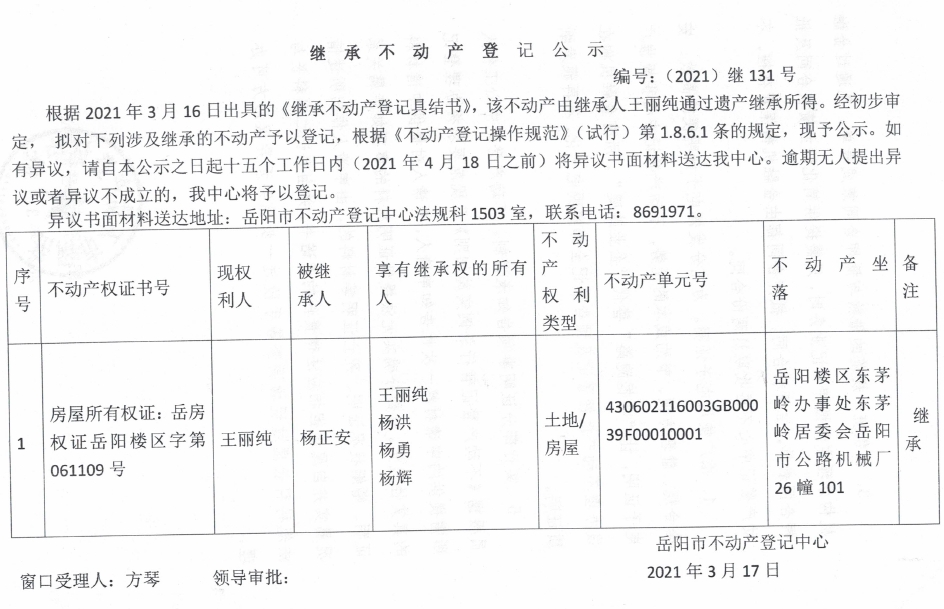 继承不动产登记公示 编号:(2021)继131号(王丽纯)