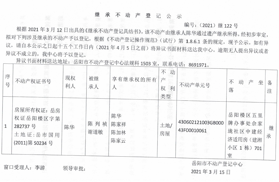 继承不动产登记公示 编号:(2021)继122号(陈华)