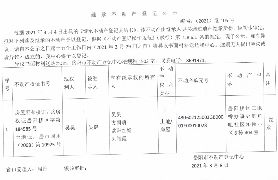 继承不动产登记公示 编号:(2021)继105号(吴昊)