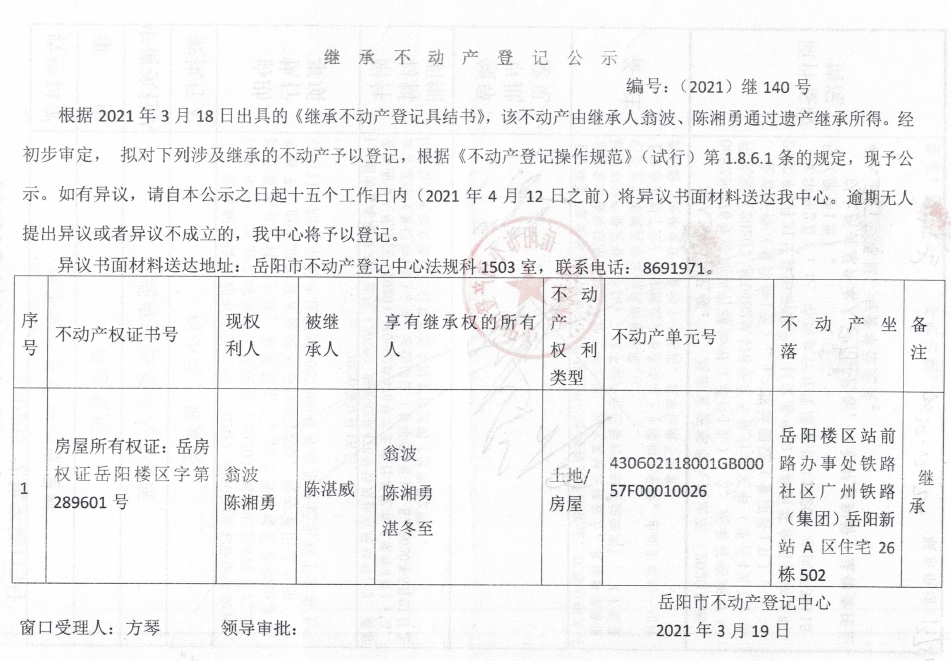 继承不动产登记公示 编号:(2021)继140号(陈湘勇)