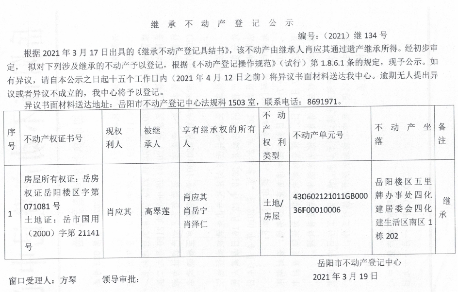 继承不动产登记公示 编号:(2021)继134号(肖应其)