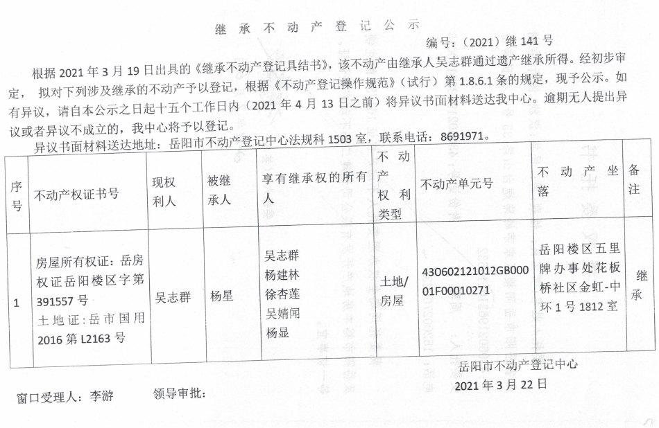 继承不动产登记公示 编号:(2021)继141号(吴志群)