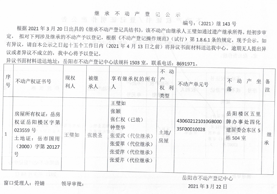 继承不动产登记公示 编号:(2021)继143号(王壁如)