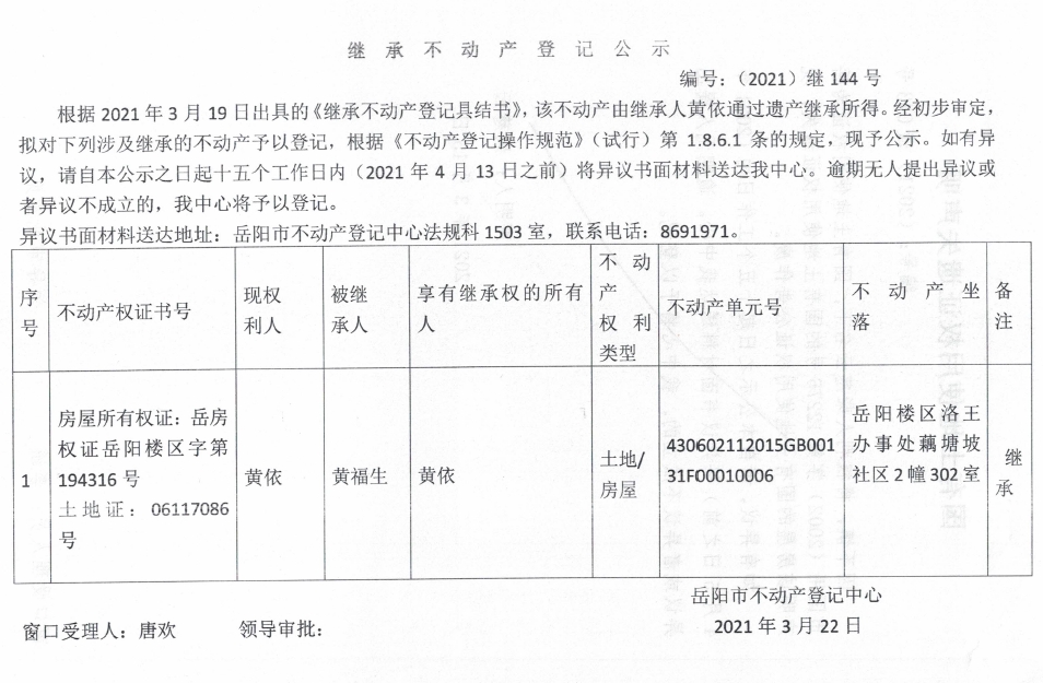 继承不动产登记公示 编号:(2021)继144号(黄依)