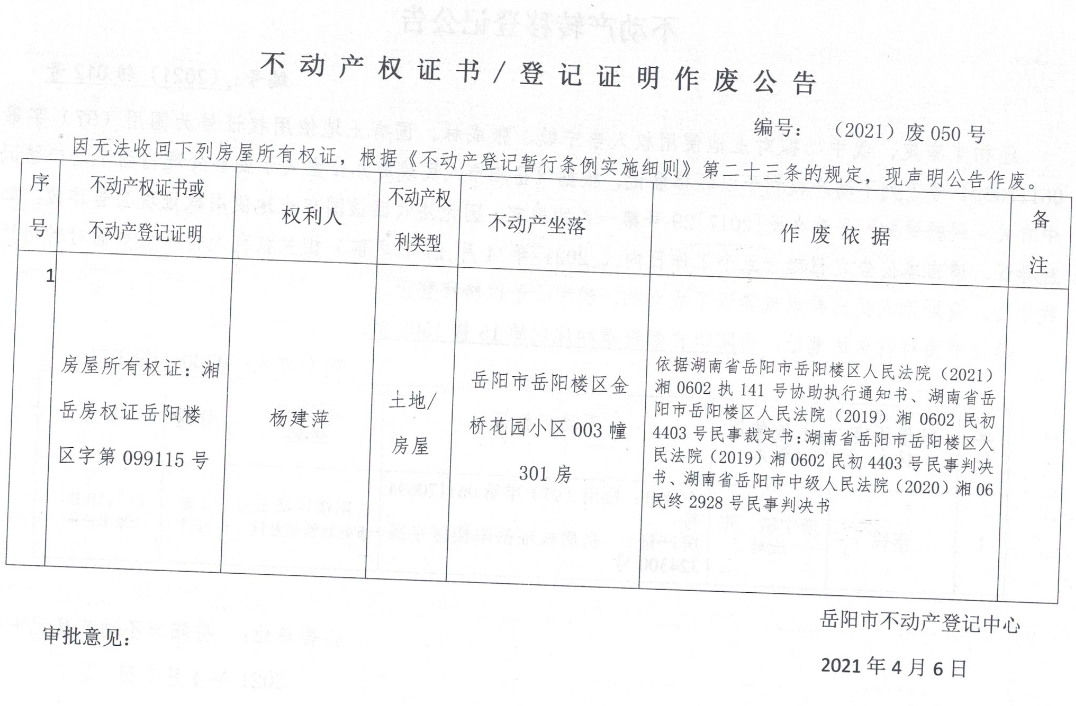 不动产权证书、登记证明作废公告 编号: (2021)废049号(杨建萍)