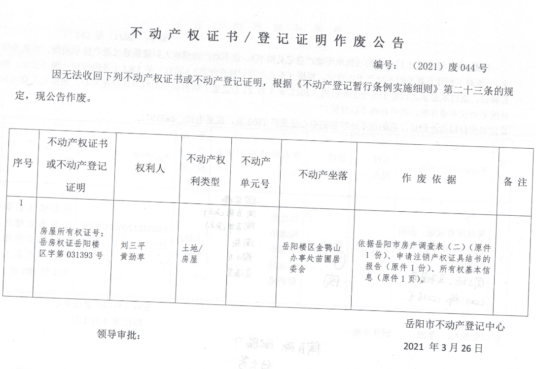 不动产权证书、登记证明作废公告 编号: (2021)废044号(刘三平、黄劲草)