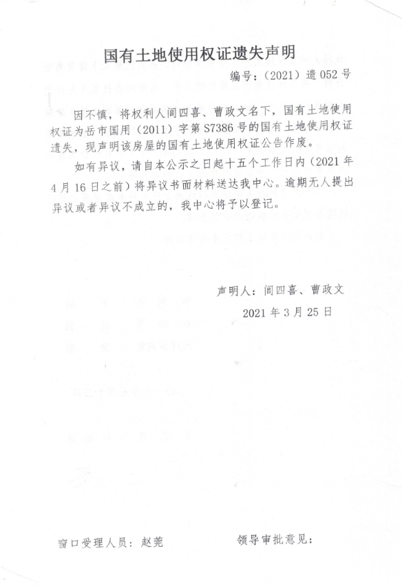 国有土地使用权证遗失声明 编号:(2021)遗052号(闾四喜、曹政文)