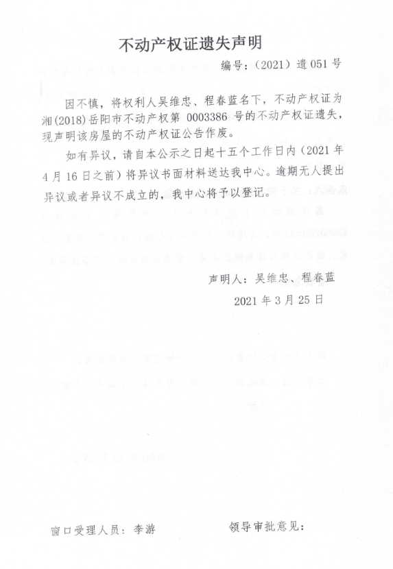 国有土地使用权证遗失声明 编号:(2021)遗051号(吴维忠、程春蓝)