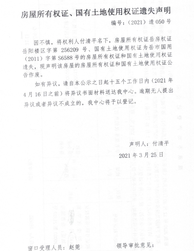 国有土地使用权证遗失声明 编号:(2021)遗050号(付清平)