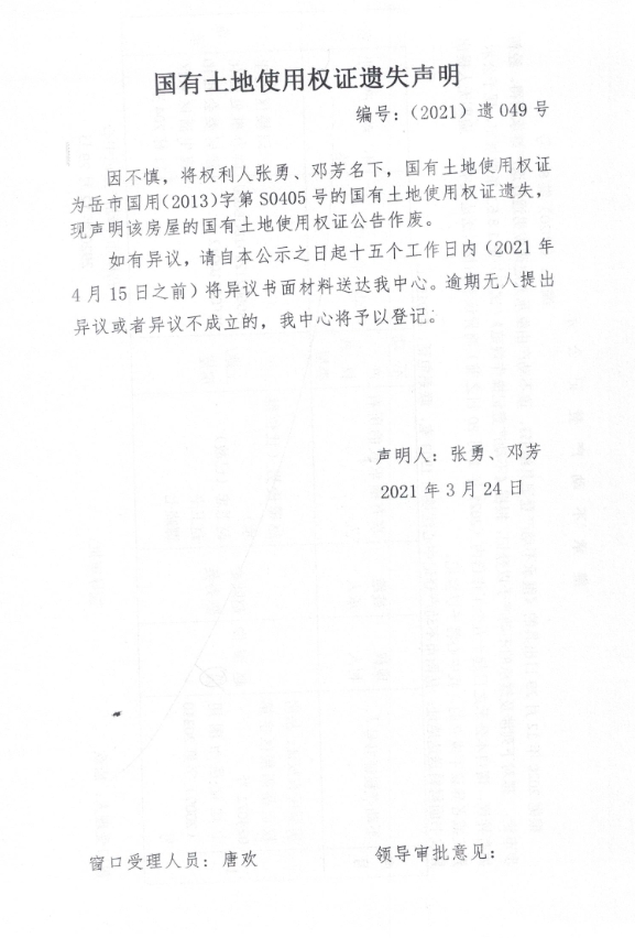 国有土地使用权证遗失声明 编号:(2021)遗049号(张勇、邓芳)