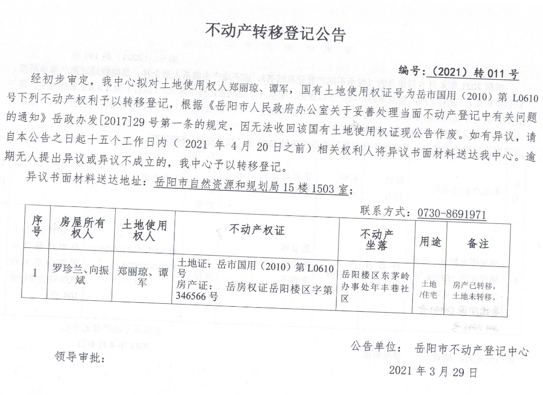 不动产转移登记公告 编号:(2021)转011号(郑丽琼、谭军)
