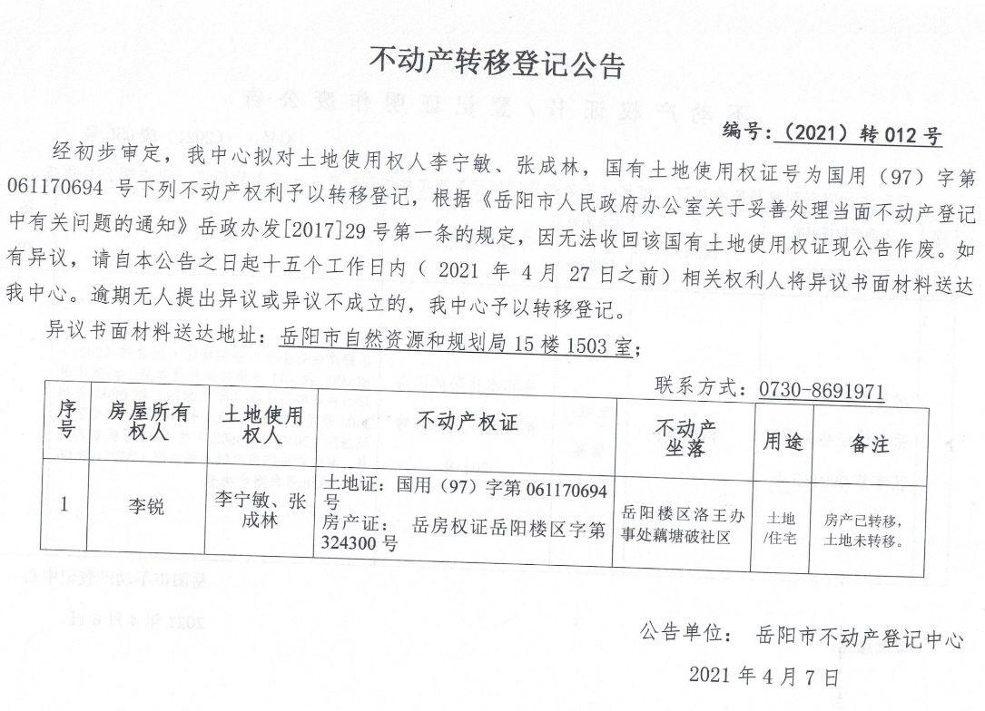 不动产转移登记公告 编号:(2021)转012号(李宁敏、张成林)