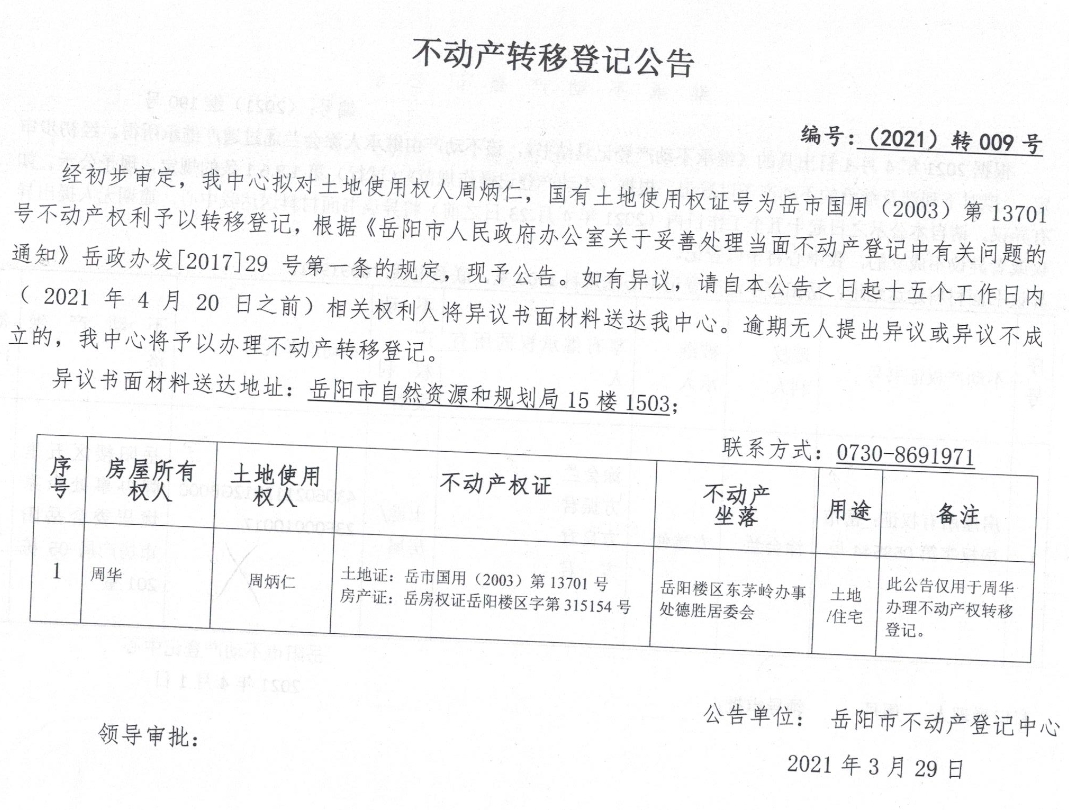 不动产转移登记公告 编号:(2021)转009号(周炳仁)