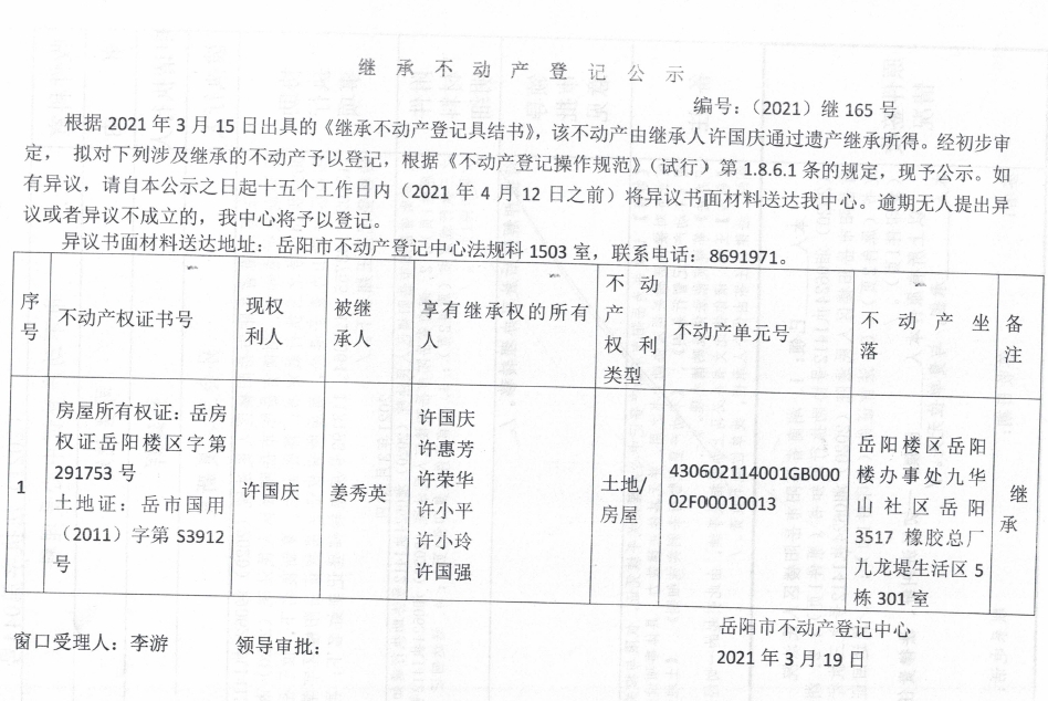 继承不动产登记公示 编号:(2021)继165号(许国庆)