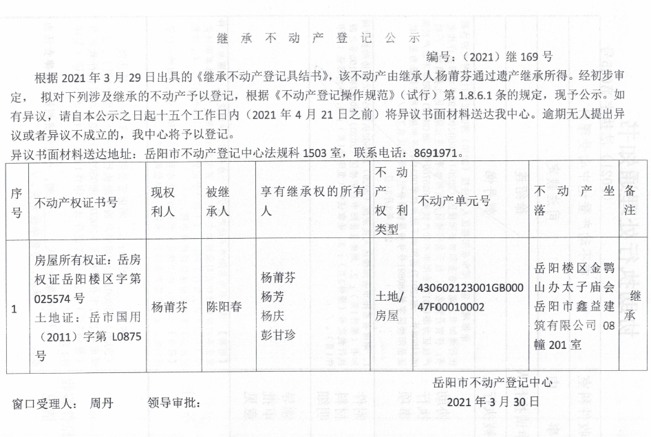 继承不动产登记公示 编号:(2021)继169号(杨莆芬)