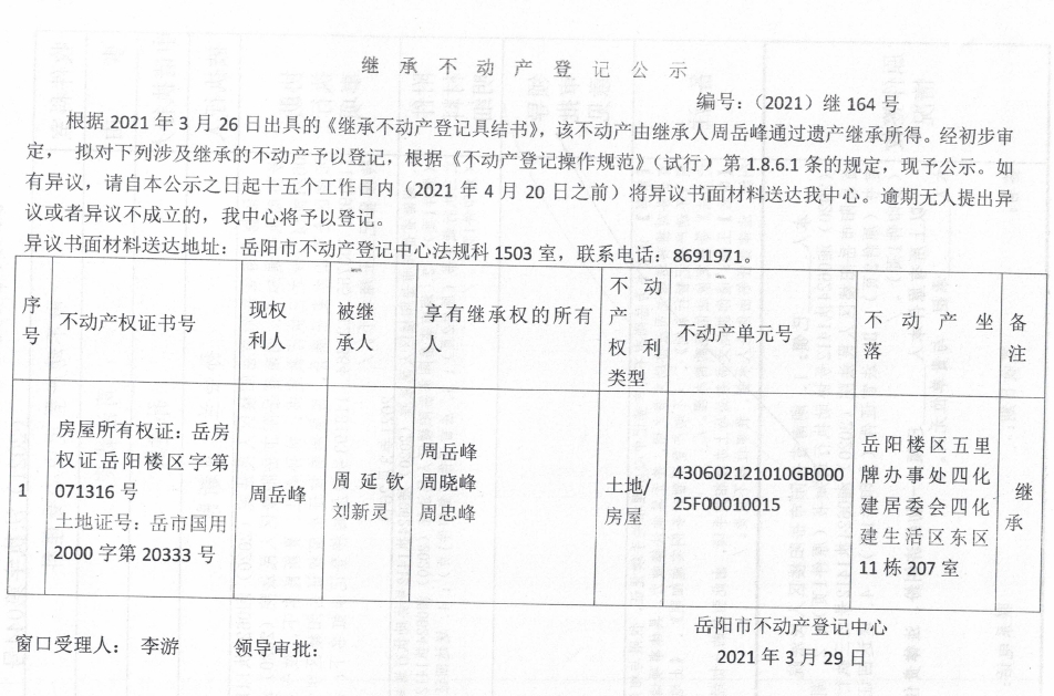 继承不动产登记公示 编号:(2021)继164号(周岳峰)