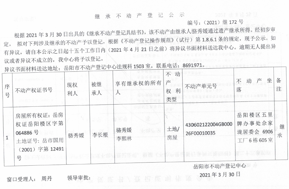 继承不动产登记公示 编号:(2021)继172号(骆秀媛)