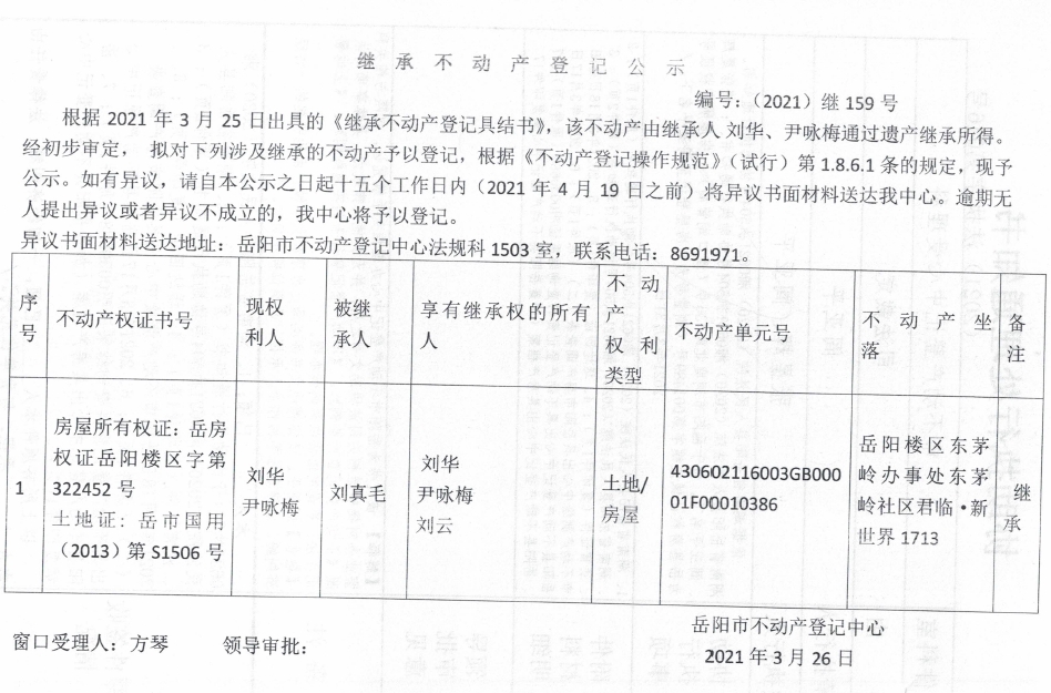 继承不动产登记公示 编号:(2021)继159号(刘华)