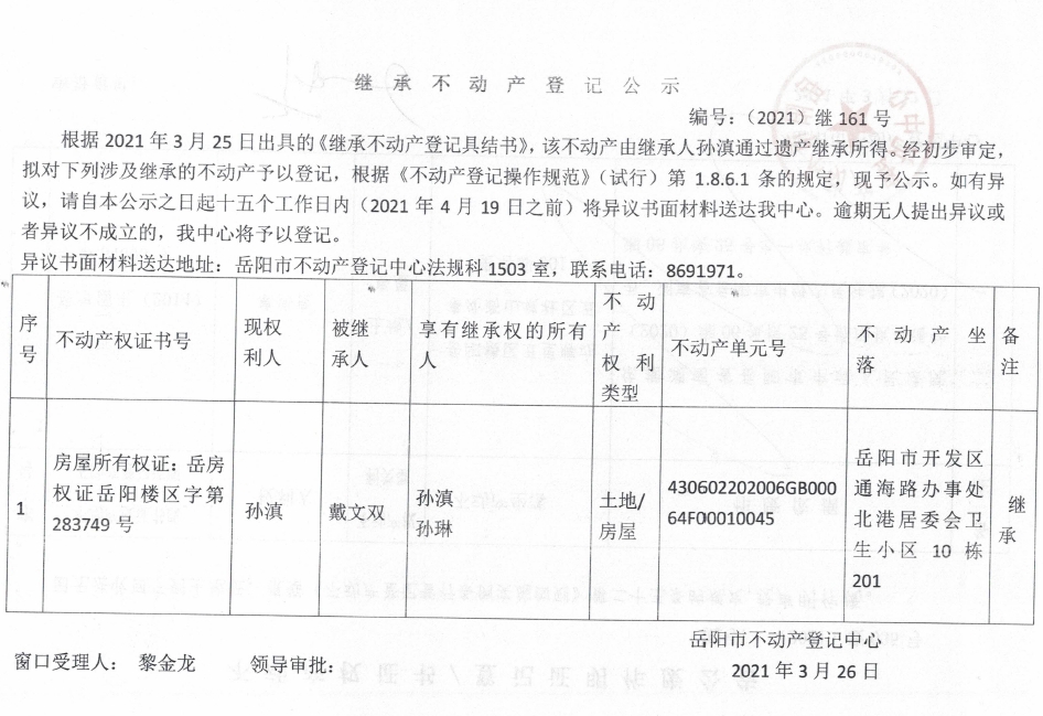 继承不动产登记公示 编号:(2021)继161号(孙滇)