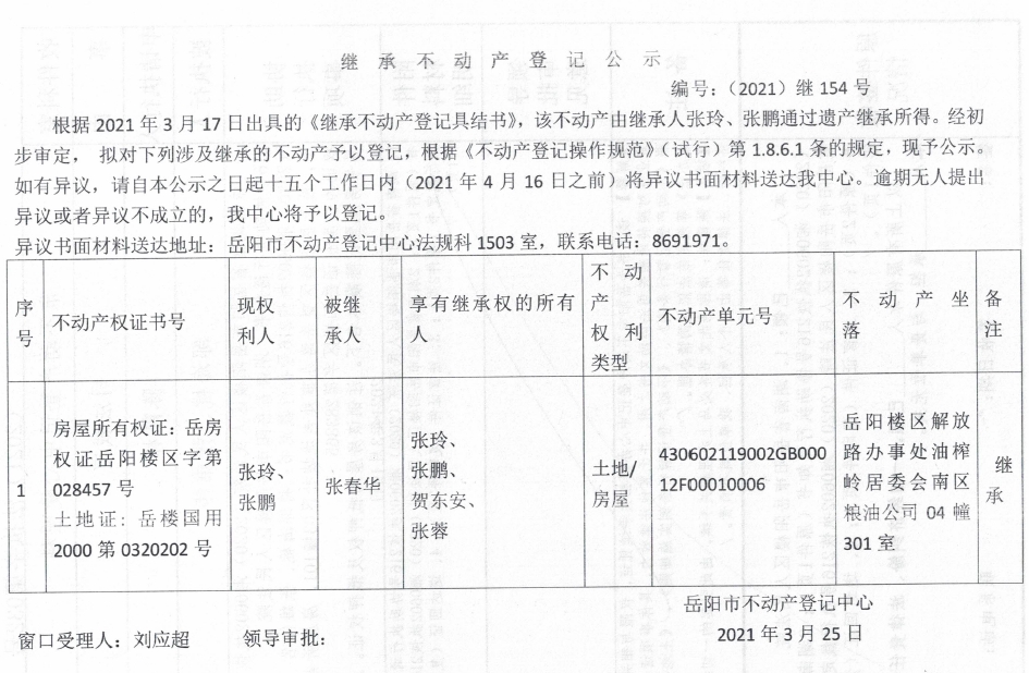 继承不动产登记公示 编号:(2021)继154号(张鹏)