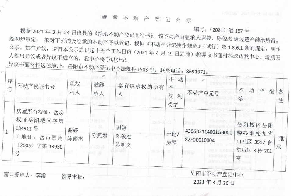 继承不动产登记公示 编号:(2021)继157号(谢婷)