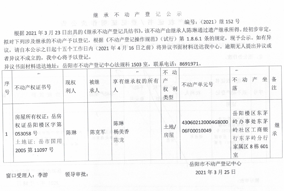 继承不动产登记公示 编号:(2021)继152号(陈琳)