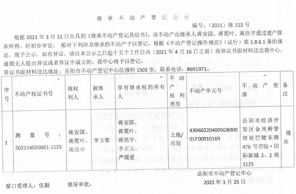继承不动产登记公示 编号:(2021)继153号(李玉蓉)
