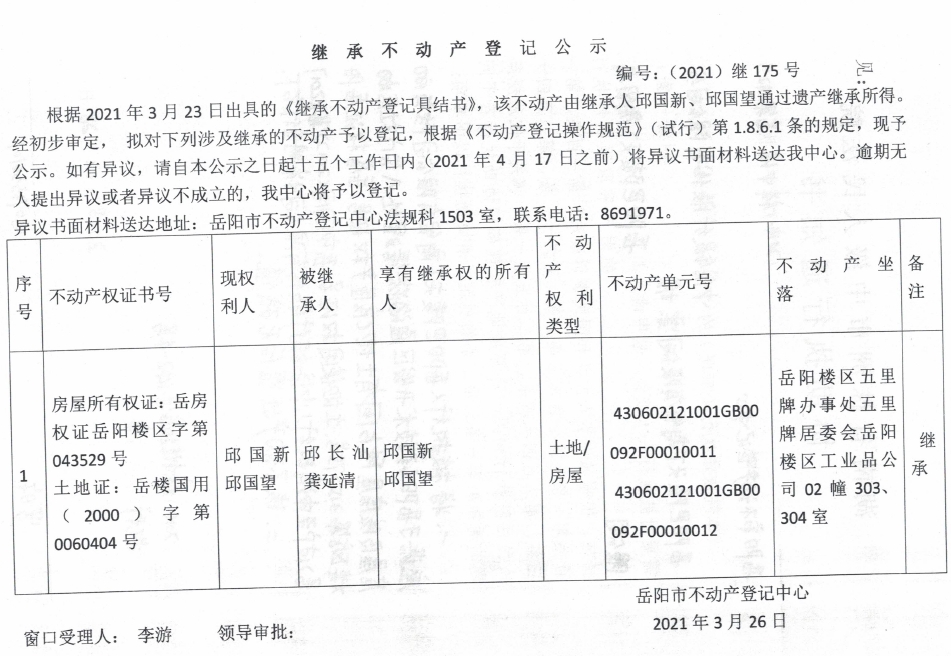 继承不动产登记公示 编号:(2021)继175号(邱国新)