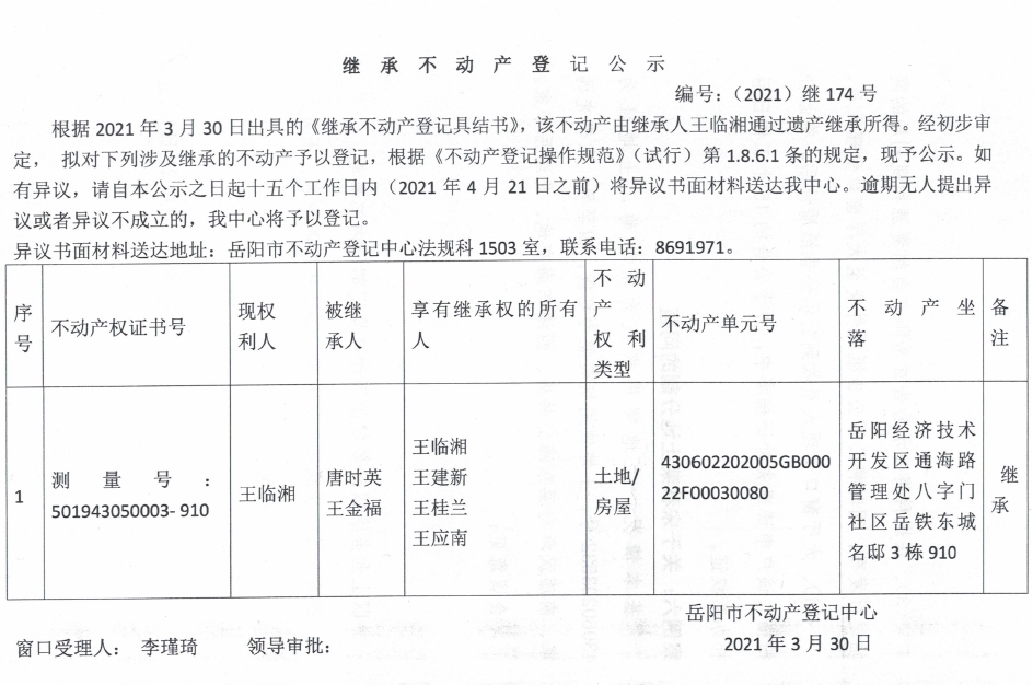 继承不动产登记公示 编号:(2021)继174号(王临湘)