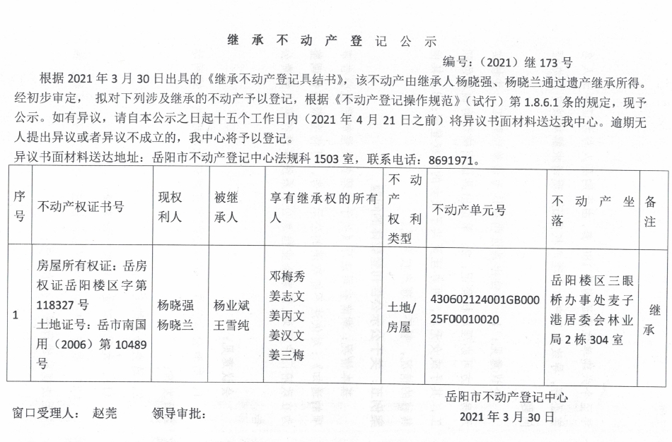 继承不动产登记公示 编号:(2021)继173号(杨晓兰)