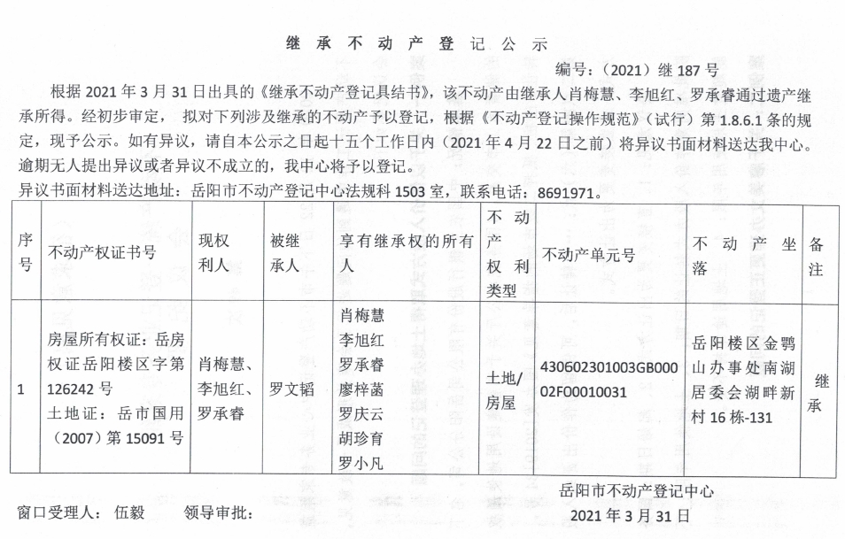 继承不动产登记公示 编号:(2021)继187号(肖梅慧)