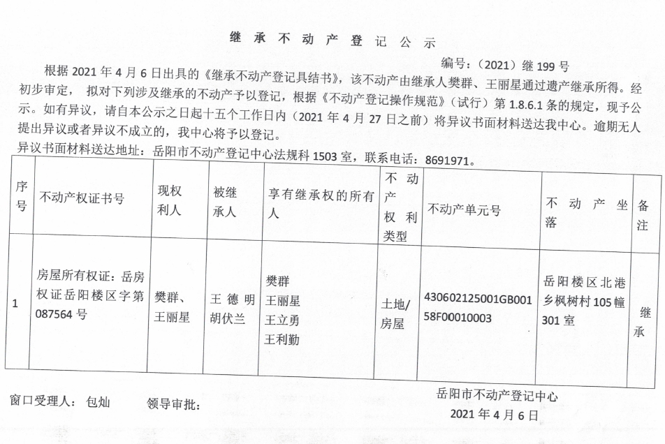 继承不动产登记公示 编号:(2021)继199号(王丽星)