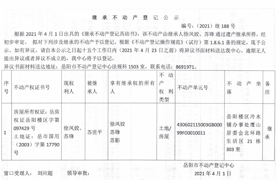 继承不动产登记公示 编号:(2021)继188号(苏锋)