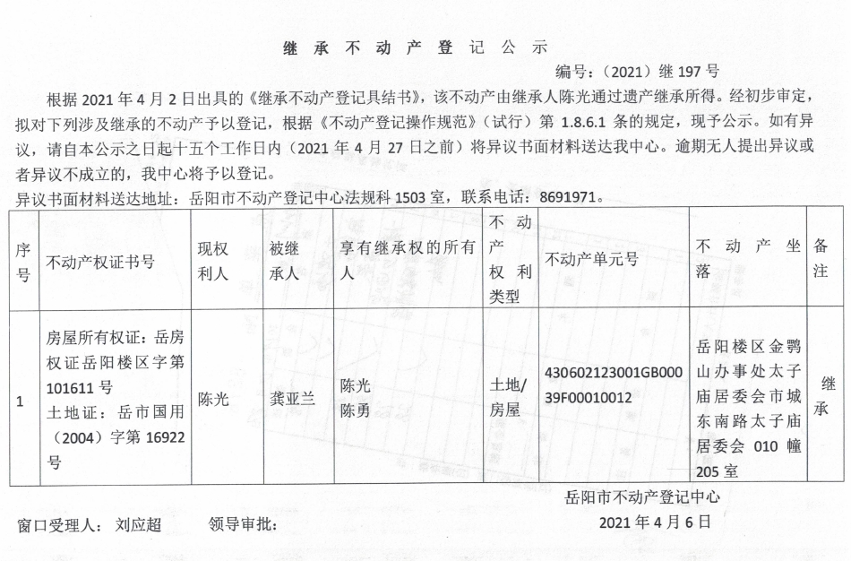继承不动产登记公示 编号:(2021)继197号(陈光)