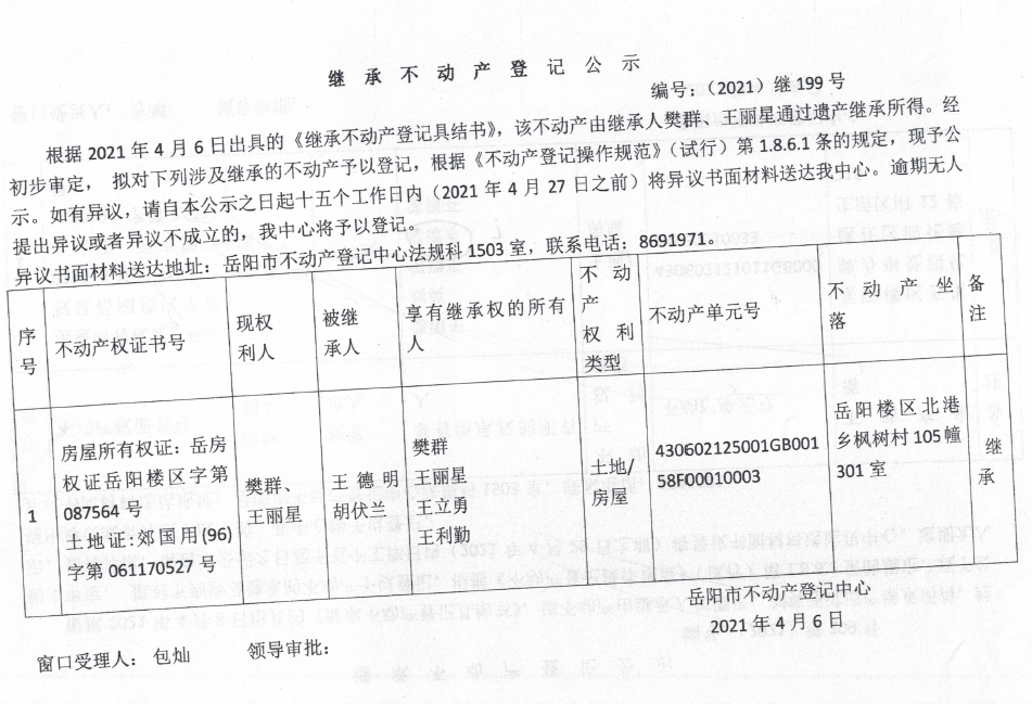 继承不动产登记公示 编号:(2021)继199号 (王丽星)