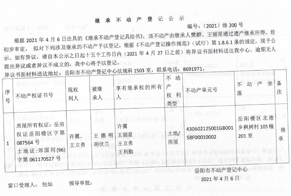 继承不动产登记公示 编号:(2021)继200号(王立勇)