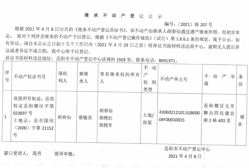 继承不动产登记公示 编号:(2021)继207号(胡春仙)