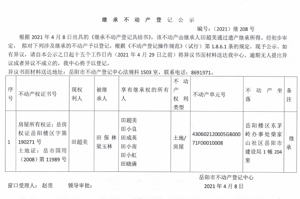 继承不动产登记公示 编号:(2021)继208号(田超美)