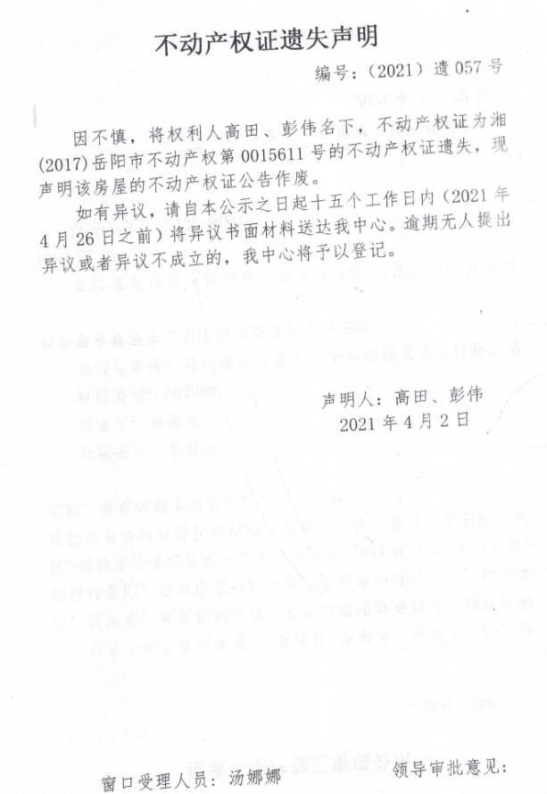 不动产权证遗失声明 编号(2021)遗057号(高田、彭伟)