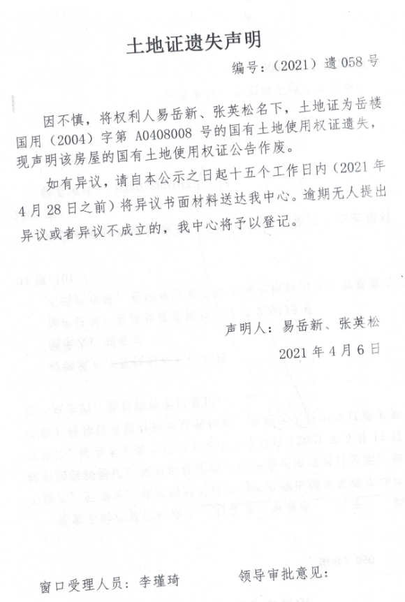 不动产权证遗失声明 编号(2021)遗058号(易岳新、张英松)