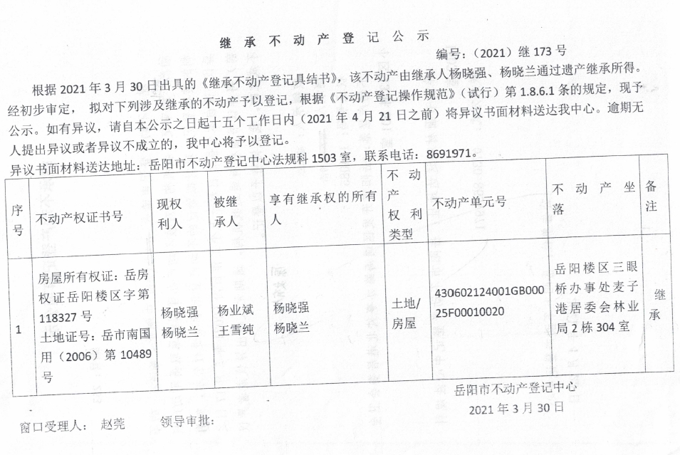 继承不动产登记公示 编号:(2021)继173号(杨晓兰)