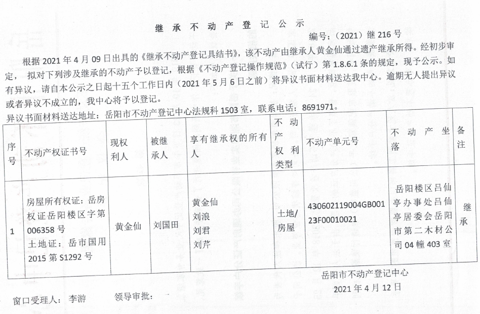 继承不动产登记公示 编号:(2021)继216号(黄金仙)