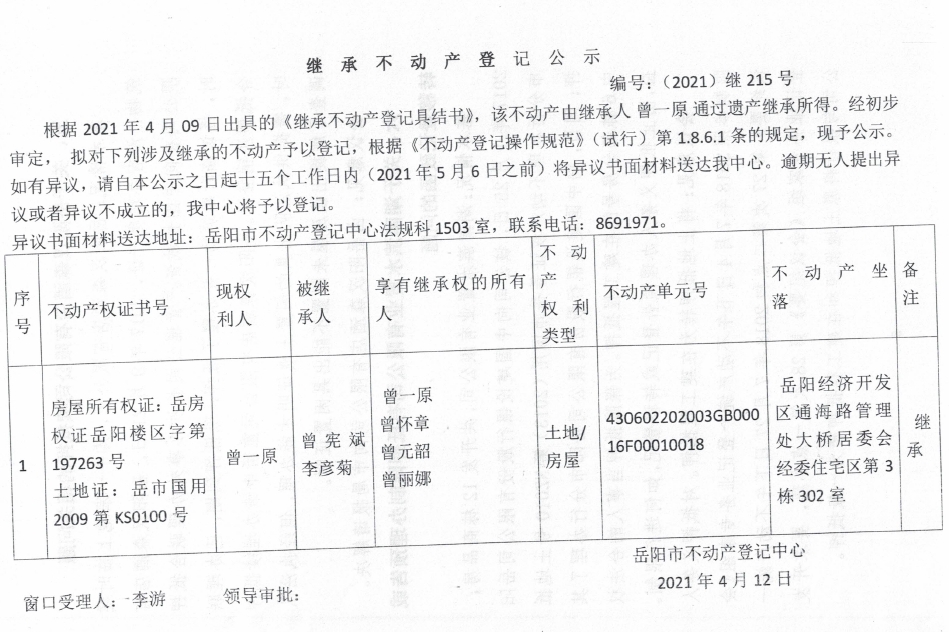 继承不动产登记公示 编号:(2021)继215号(曾一原)