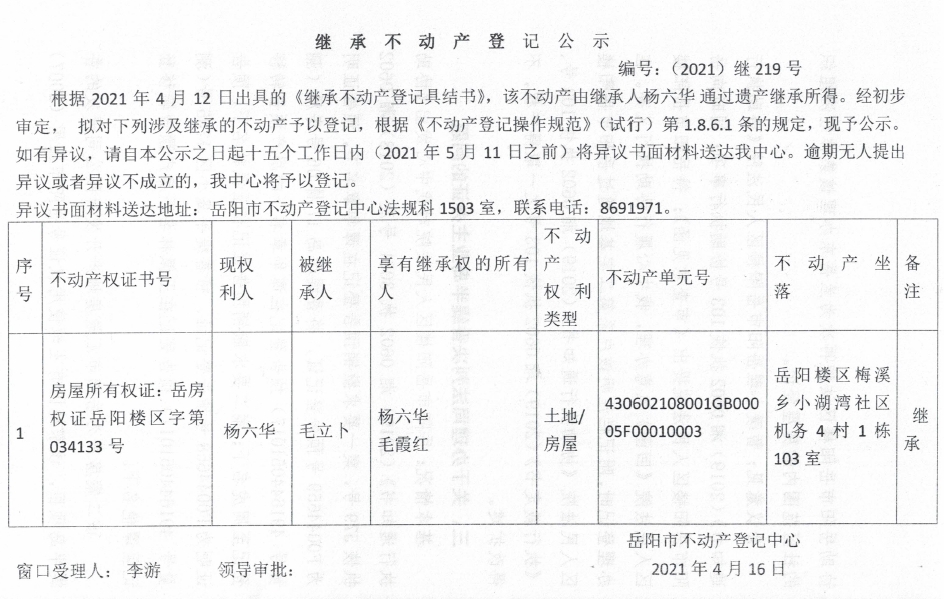 继承不动产登记公示 编号:(2021)继219号(杨六华)